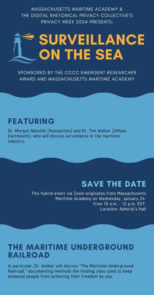 The Digital Rhetorical Privacy Collective Privacy Week 2024 presents, “Surveillance on the Sea” in conjunction with a partnership at Massachusetts Maritime Academy and UMass Dartmouth. This hybrid event via Zoom originates from Massachusetts Maritime Academy and features Dr. Morgan Banville and Dr. Tim Walker who will discuss surveillance in the maritime industry. In particular, Dr. Walker will discuss “The Maritime Underground Railroad,” documenting methods the holding class used to keep enslaved people from achieving their freedom by sea. Timothy Walker (B.A., Hiram College, 1986; M.A., Ph.D., Boston University, 2001) is Professor of History at the University of Massachusetts Dartmouth, where he serves on the Executive Board of the Center for Portuguese Studies and Culture, and as graduate faculty for the doctoral program in Luso-Afro-Brazilian Studies and Theory. Walker is a contributing faculty member of the Munson Institute of Maritime Studies, and Director of the NEH “Landmarks in American History” workshops series, titled “Sailing to Freedom: New Bedford and the Underground Railroad” (2011–2022). In 2020, Walker was appointed by the Governor of Massachusetts to serve on the Schooner Ernestina/Morrissey Advisory Board, where he is the chair of the Educational Programming Committee. This event is organized by Dr. Morgan Banville at Massachusetts Maritime Academy.