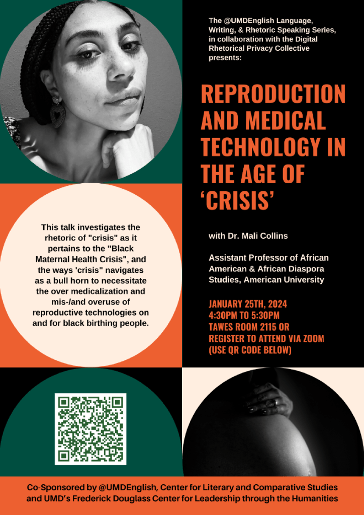 University of Maryland–College Park: The @UMDEnglish Language, Writing, & Rhetoric Event Series in collaboration with the Digital Rhetorical Privacy Collective present: “Reproduction & Medical Technology in the Age of ‘Crisis’” a talk by Dr. Mali Collins. This talk investigates the rhetoric of “crisis” as it pertains to the “Black Maternal Health Crisis”, and the ways ‘crisis” navigates as a bull horn to necessitate the over medicalization and mis-/and overuse of reproductive technologies on and for black birthing people. Thursday 1/25 4:30-5:30pm Tawes Building Rm 2115 and via Zoom. This event is co-sponsored by UMD English and the UMD Frederick Douglass Center for Leadership.
